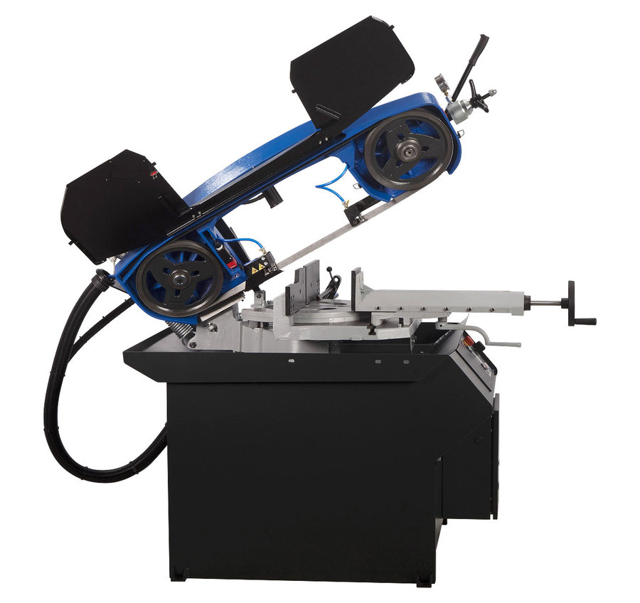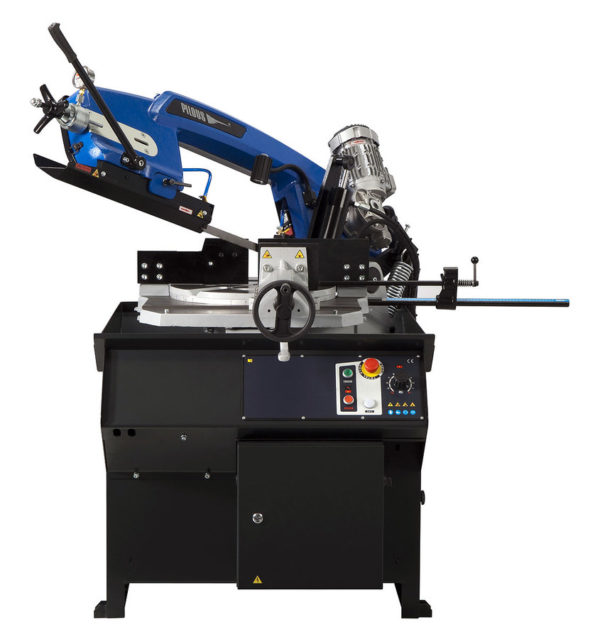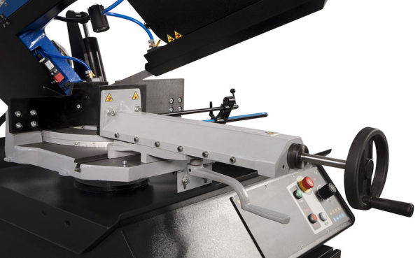 Stroj je opremljen s preprosto hidravlično enoto, ki omogoča samodejno dvigovanje roke žage po končanem rezu. Ta sistem precej olajša delovanje stroja, zlasti pri žaganju večjih serij. Višino dviga lahko prilagodite glede na velikost materiala, ki ga je treba žagati. Podajanje v rez se izvaja s težo roke, z možnostjo nenehne regulacije s pomočjo oljnega loputa z dušilcem olja. Ko je žaganje končano, se tračni pogon samodejno izklopi in ročica se dvigne v nastavljeni položaj. Novi sitem žage prispeva k vsestranski uporabi z zagotavljanjem dvostranske neprekinjene nastavitve kota žaganja v območju med 60 ° na desni in 45 ° na levi.