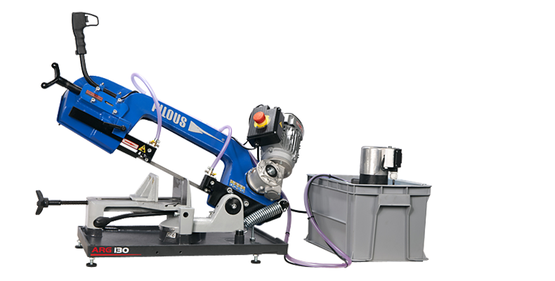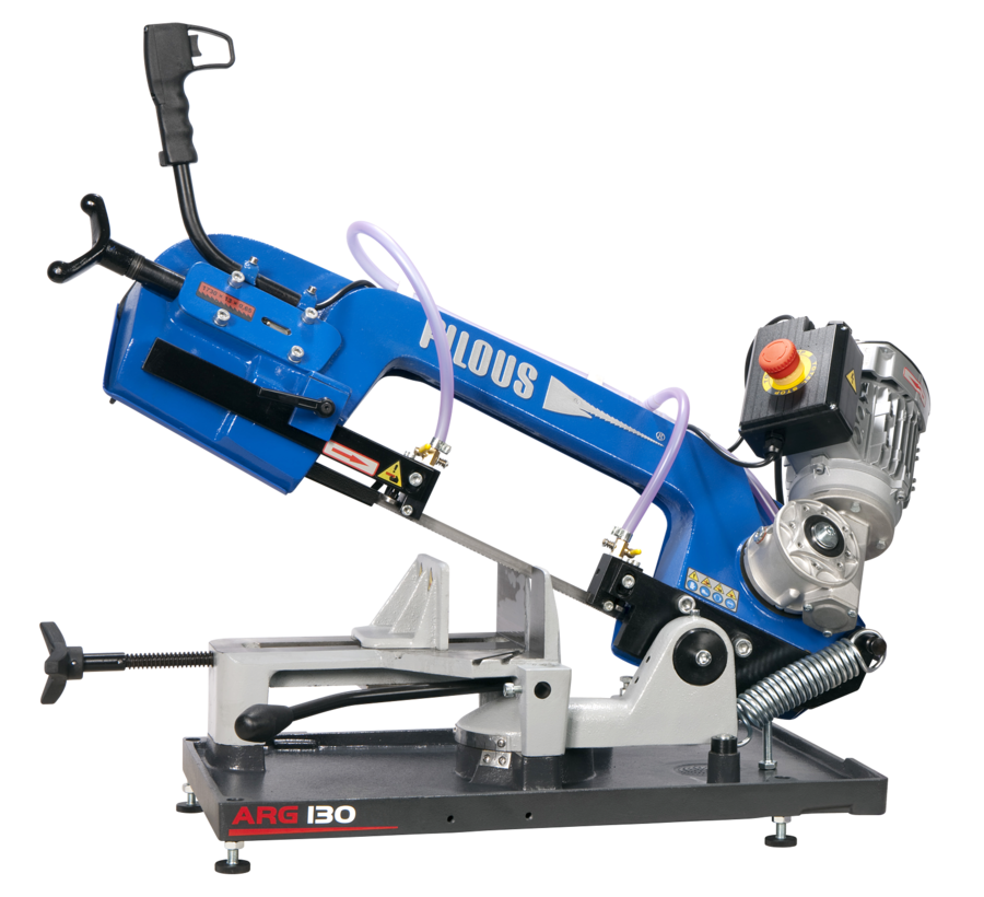 Tračna žaga ARG 130 je univerzalna “majhna” tračna žaga je ocenjena za splošno uporabo v različnih delavnicah (delo na ključavnicah, vzdrževanje), v obratih s stroji in v poljskih inštalacijah. Robusten okvir stroja je izdelan iz litine. Dovajanje v žaganje je ročno proti tlaku vzmeti.