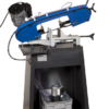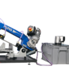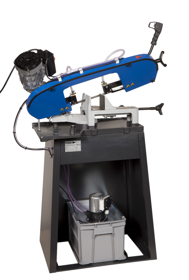 Tračna žaga z osnovo in hlajenjem. Stroj je povezan s celotnim hladilnim sistemom s profesionalno visokozmogljivo črpalko in možnostjo regulacije pretoka na obeh vodilnih glavah. Rezervoar za hladilno tekočino je nameščen v dnu stroja. Ta različica omogoča namestitev podajalnih trakov pred in po rezu.